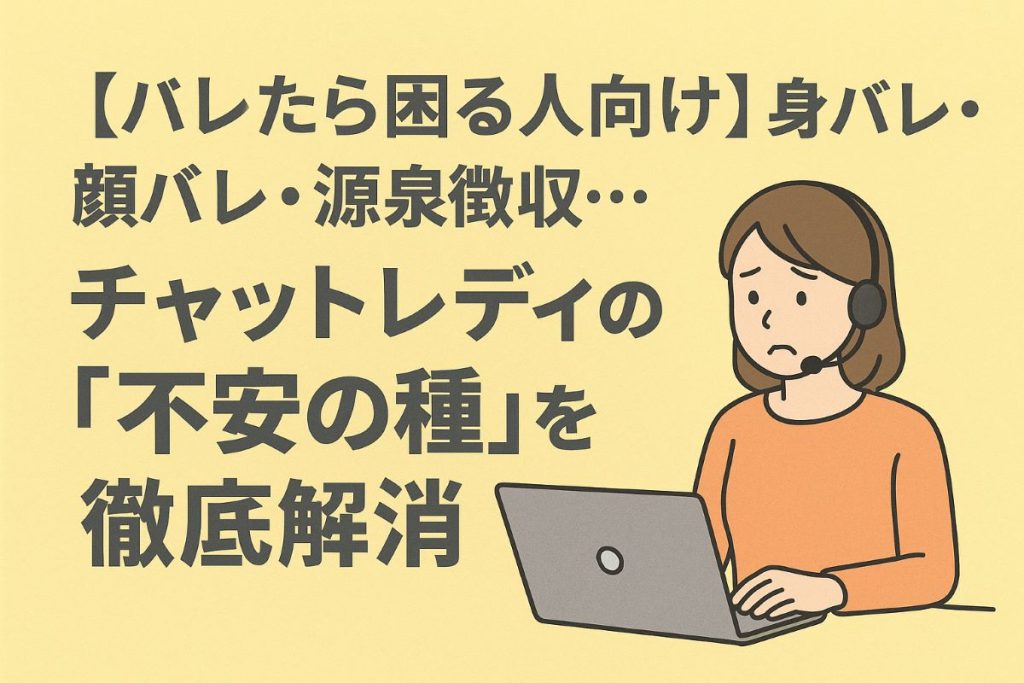 【バレたら困る人向け】身バレ・顔バレ・源泉徴収...チャットレディの「不安の種」を徹底解消 チャットレディは、高収入と自由な働き方が魅力ですが、「会社や家族にバレたらどうしよう」「税金関係が複雑そう」といった**不安の種**がつきものです。 しか... -